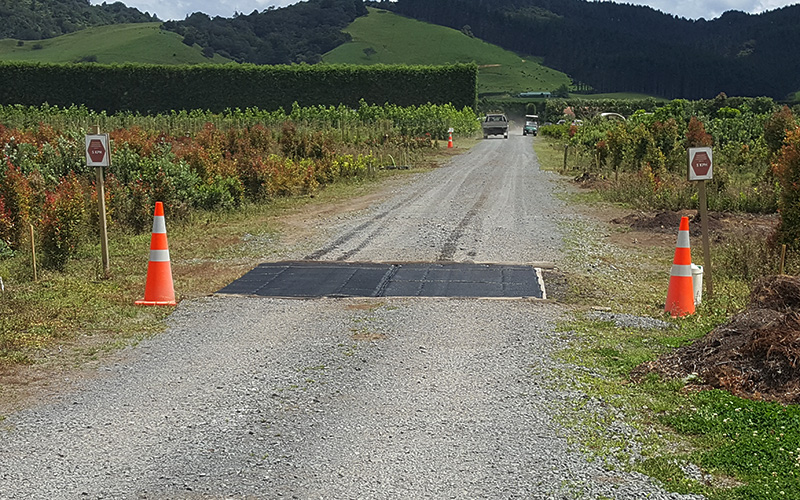The Shoof Vehicle Disinfection Mat is supplied in two parts that are domed together along the centre line for use. There are stainless steel eyelets in the corners for securing to the roadway if required. The road surface must be smooth under the mat. Asphalt is excellent, chip seal is acceptable if it is fine chip. If the road is coarse chip seal, plain gravel or sand, it should be covered with plywood under the mat.
