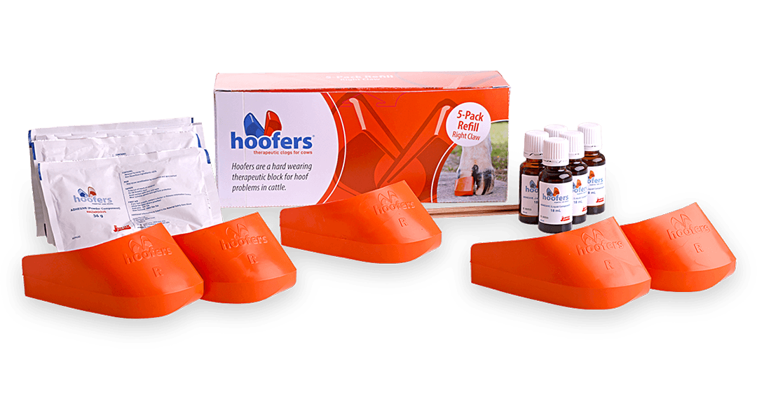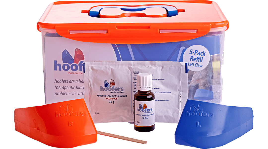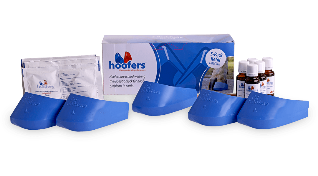The Hoofers starter pack includes 5x left and 5x right clogs, 10x glue liquid, 10x glue powder, stirring sticks and a claw checker all in a practical storage case. You can also purchase left or right refill packs separately.