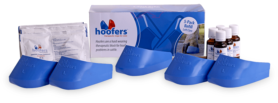 The Hoofers starter pack includes 5x left and 5x right clogs, 10x glue liquid, 10x glue powder, stirring sticks and a claw checker all in a practical storage case. You can also purchase left or right refill packs separately.
