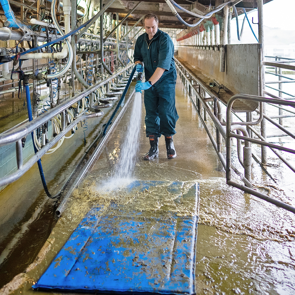 Placement: We advise using Hoofmats at the ENTRANCE to the milking platform (herringbone dairies will require two). This ensures that the treatment solution has adequate time to work – cows have their feet treated before standing quietly being milked. Hoofmats do not require securing to the floor. Simply place where required and pour on the remedy of your choice before commencement of milking. Top up the Hoofmats after 80-100 cows, or as required during milking.