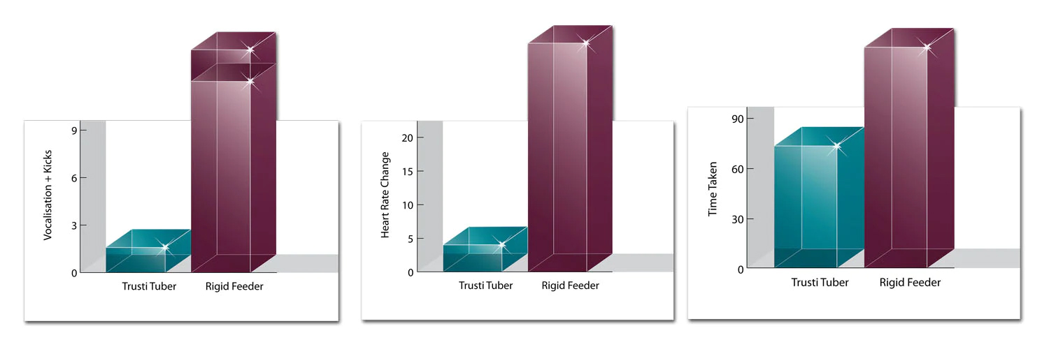 The Trusti Tuber and Flexi Tuber calf drenchers are specially designed to ensure the tube will move naturally with the anatomy of the calf and the natural swallowing mechanism. This means optimum comfort and safety for the calf. Stress to the calf is also minimised by preventing pressure on the airway entrance during feeding, enabling the calf to breathe easily. Users notice straight away how much more relaxed their calves are, making the procedure much more pleasant. The Trusti Tuber proved an 88% reduction in behavioural stress when compared with a rigid feeder.