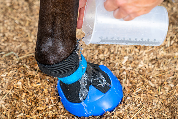 You can simply pour your solution of choice into the Tubbease (directed at the sock portion) once it is on, and add more as required OR dunk the hoof, with the Tubbease on, into a bucket of solution.